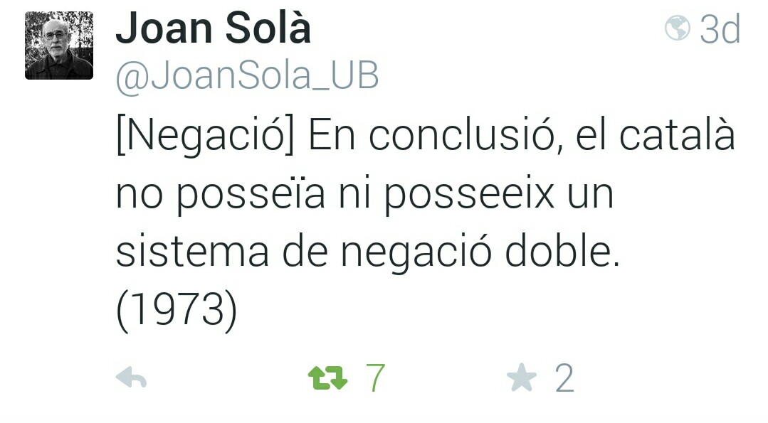 El dia de Sant Jordi es va estrenar el Twitter Oficial Joan Solà. S'hi publicaran petits fragments extrets d'obres seves fins al 27 d'octubre, que farà cinc anys que va morir. Per als que no sou gaire de Twitter, en aquest blog vaig penjant periòdicament reculls de piulades (l'índex, a baix de tot). (El número entre parèntesis correspon a l'obra de la qual s'ha extret el fragment.)